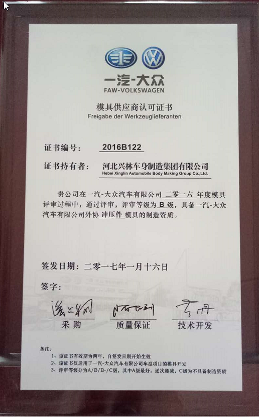 我公司獲得一汽-大眾模具供應商認可證書