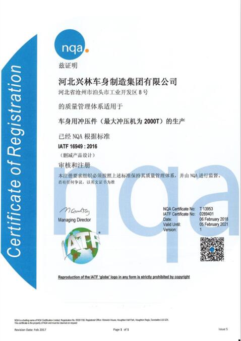 近日,經過NQA的嚴格審定,河北興林車身制造集團有限公司順利通過了IATF(International Automotive Task Force)認證,并收到了IATF16949:2016質量管理體系認證證書。