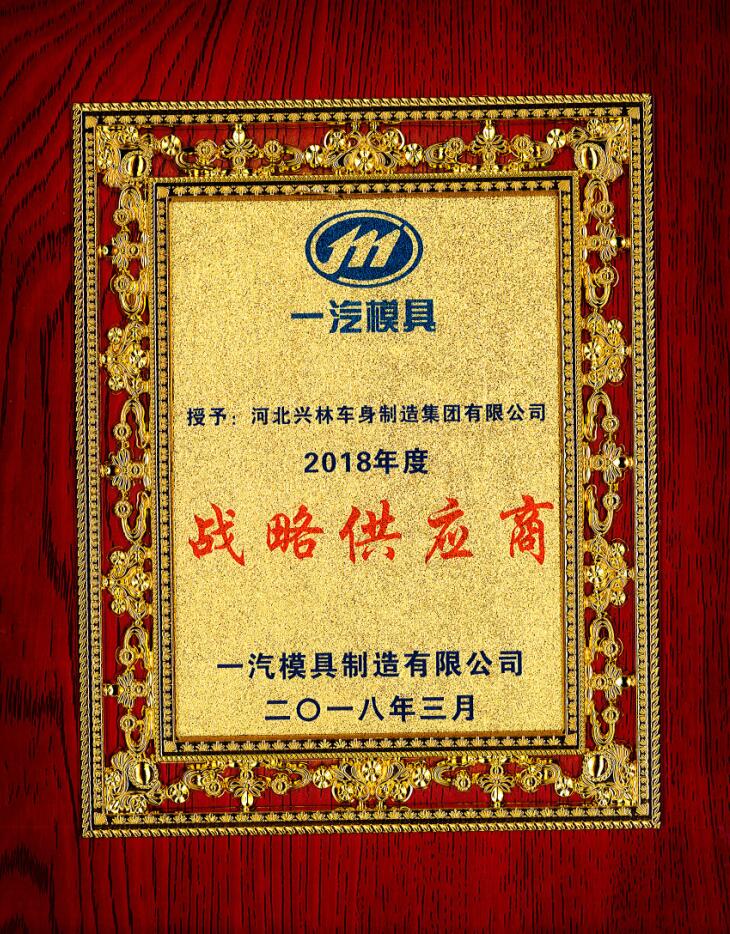 3月29日一汽模具制造有限公司2018年度供應鏈大會在吉林長春召開!會上,河北興林車身制造集團有限公司憑借優異的產品質量,被授予2018年度“戰略供應商”!河北興林車身制造集團有限公司 總經理葛總出席會議并領獎!