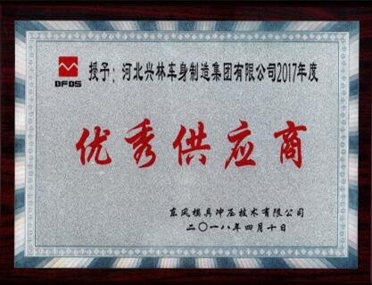 2018年4月10日在東風模具沖壓技術有限公司2018年供應商大會上,河北興林車身制造集團有限公司憑借產品質量過硬、交貨迅速及時、服務細致周到,被東風模具沖壓技術有限公司授予2017年度“優秀供應商”榮譽稱號。